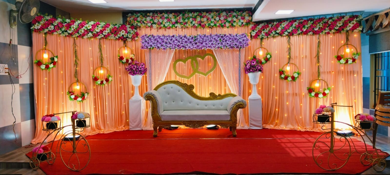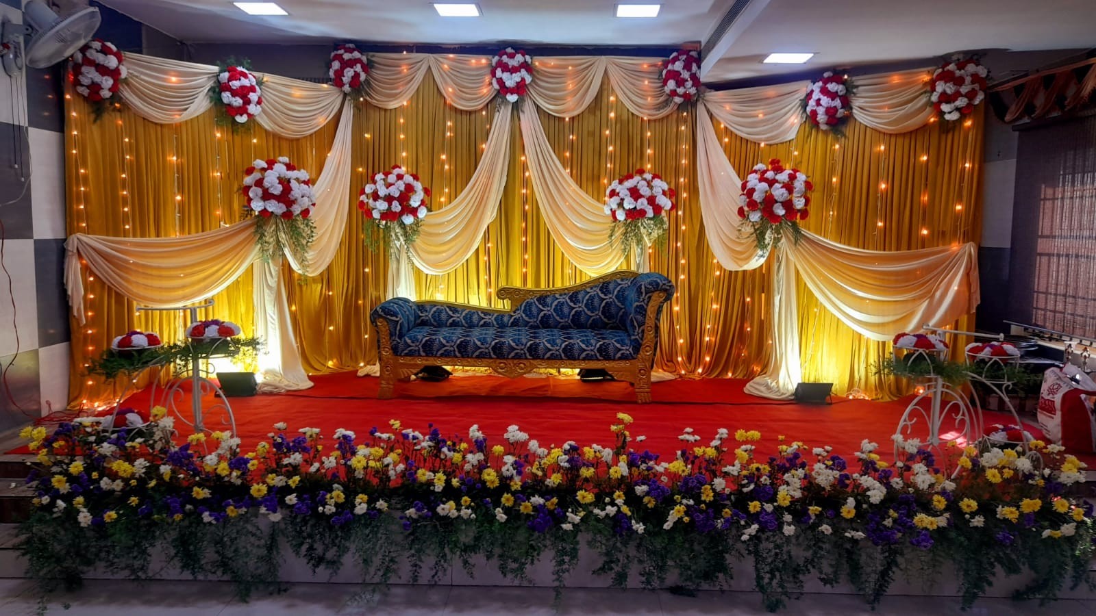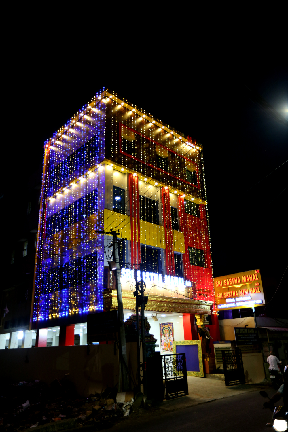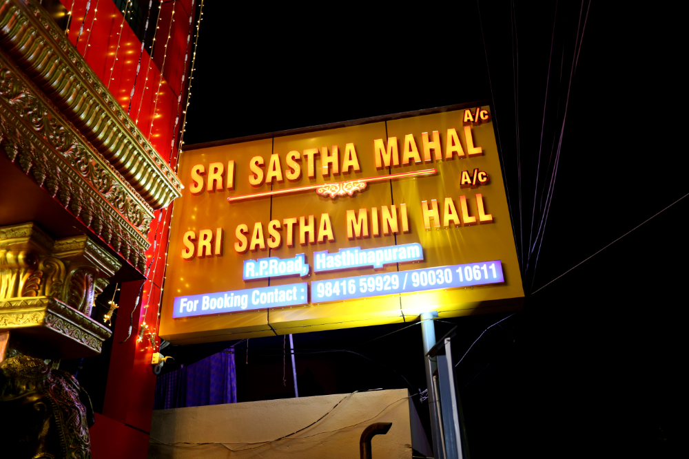 Now enjoy your occasion with a touch of gold in our Sri Sastha Mini Hall A/C. Every tiny celebration becomes a large effort for us, and every big party becomes a huge success. With her ability to create a blissful mood, Srisastha elevates the beauty of your event and makes it unforgettable. Wedding, engagement, reception, Seemantham, birthdays, Upanayanam, puberty, and other events can all be celebrated with Sri Sastha Mini Hall A/C.